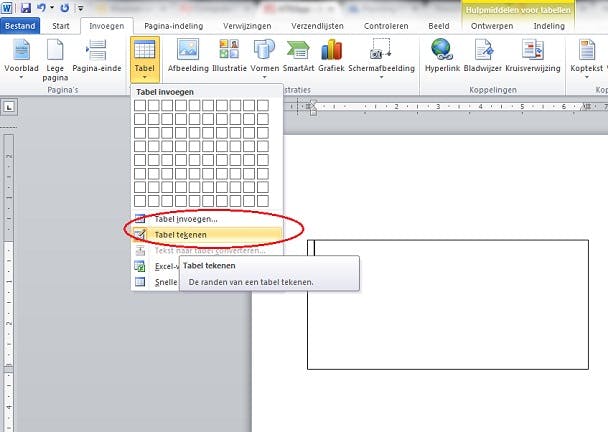 Naast de mogelijkheid om een tabel in te voegen met vooraf ingestelde hoeveelheid rijen en kolommen, biedt Word ook de mogelijkheid om "uit het vuistje" tabellen te tekenen. Deze functie bereik je via Invoegen, dan Tabel en vervolgens Tabel tekenen.