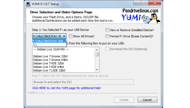 Er zijn diverse tools waarmee je een usb-stick opstartbaar kunt maken. Onze voorkeur gaat uit naar YUMI (Your Universal Multiboot Installer), met name omwille van het gebruiksgemak en de flexibiliteit. De tool heeft geen installatie nodig. Zorg dat je stick in de pc steekt, start het programma op, ga akkoord met de gebruiksovereenkomst en verwijs naar de (juiste!) usb-stick in het uitklapmenu. Eventueel plaats je eerst een vinkje bij Showing All Drives.