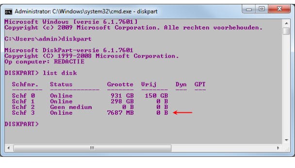 Daarna voer je het commando diskpart uit. Achter de nieuwe prompt voer je de opdracht list disk uit. Op basis van de grootte kun je je stick vervolgens identificeren, het schijfnummer lees je af in de kolom Schfnr.