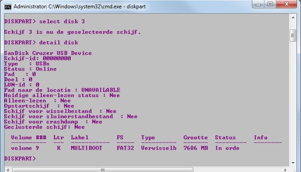 Je selecteert je usb-stick met de opdracht select disk . Je krijgt vervolgens de melding Schijf x is nu de geselecteerde schijf. Maar het commando detail disk geeft je veel meer informatie over je usb-stick. De volgende stap is het opschonen van de stick met het commando clean of, grondiger nog, met clean all. Met dit laatste commando overschrijf je namelijk alle sectoren, een proces dat echter lang kan duren.
