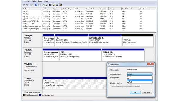 Voer de volgende drie commando's uit (telkens gevolgd een Enter): 'create partition primary', 'assign', 'exit'. Er verschijnt nu een Windows-venster waarin je de knop 'Schijf formatteren' aanklikt en bij 'Bestandssysteem' de optie 'FAT32 (standaard)' selecteert. Verwijder bij voorkeur het vinkje bij 'Snelformatteren' en bevestig met 'Starten'. Is de stick groter dan 32 GB, dan moet je uitwijken naar een gratis tool als FAT32 Format. Gebruik tot slot het programma YUMI (stap 2) opnieuw, dit keer zonder vinkje bij de optie 'Format X: Drive'.