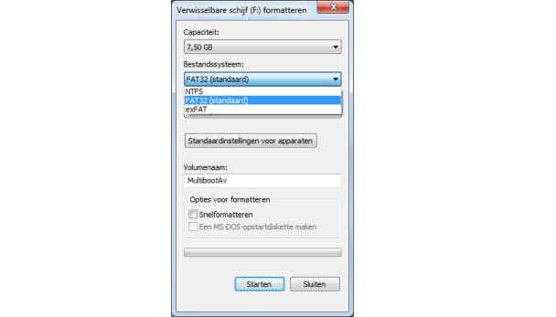 Er zijn verschillende bestandssystemen mogelijk waarin je de usb-stick kunt formatteren, waaronder FAT32 en NTFS. Een voordeel van NTFS is dat het bestanden van meer dan 4 GB aankan. Maar aangezien wij in de volgende stappen in een (grafische) Linux-omgeving werken, is NTFS geen echte optie. Linux vereist namelijk een FAT(32)-medium om te kunnen booten (en ook een UEFI-stick heeft FAT32 nodig, zie kader UEFI omzeilen). Wij kiezen in daarom voor FAT32.