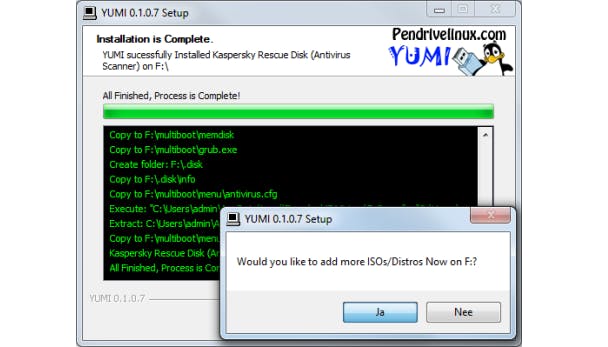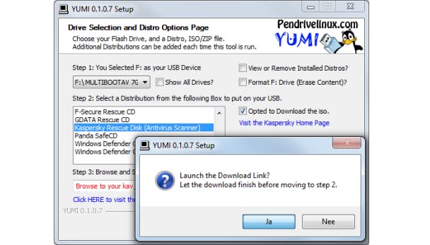 Bevestig de vraag of je de downloadlink wil lanceren met Ja en wacht tot de download is afgerond. Vervolgens klik je op Browse en wijs je YUMI de weg naar het gedownloade iso-bestand. Staat dat eenmaal klaar, dan druk je op de knop Create en bevestig je je beslissing. Het iso-bestand wordt nu automatisch uitgepakt en aan je stick toegevoegd. Na afloop druk je op Next en bevestig je met Ja als je nog andere distro's aan je stick wil toevoegen. Wij herhalen de procedure alvast voor AVG en BitDefender. Na afloop sluit je YUMI af met Finish.