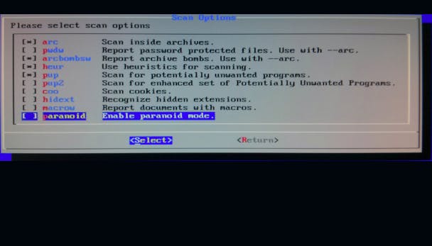AVG toont je nu het Options-menu waarin je via de spatiebalk alle gewenste scanopties kunt activeren. Naast de standaardopties raden we je aan ook Scan inside archives aan te stippen. Levert de normale scanronde niets op en vermoed je toch een infectie, dan kun je de scan eventueel opnieuw uitvoeren in Paranoid Mode.