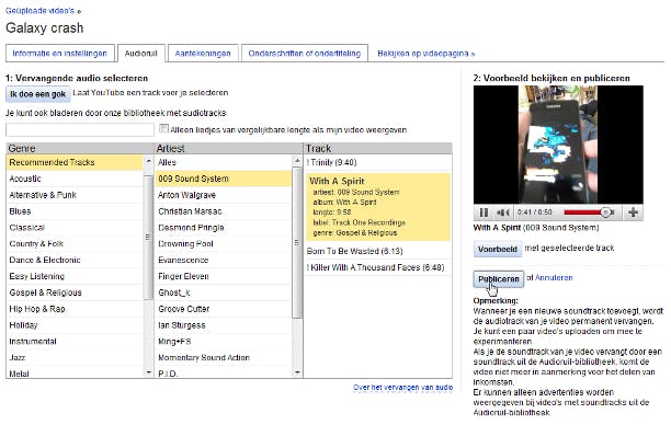YouTube heeft een beperkte collectie muziek voor u online staan. Wilt u het geluid van uw filmpje veranderen, dan klikt u op het tabblad Audioruil. Kies uit een van de nummers en klik op de knop Voorbeeld. Is het naar wens, dan klikt u op Publiceren.