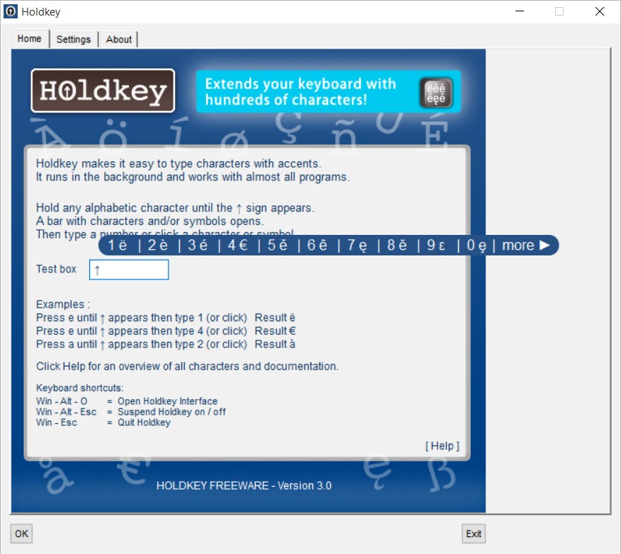 Na korte tijd verschijnt het hoofdscherm en kun je aan de slag. In de Test box kun je oefenen met het programma. Om een accent te typen houd je de betreffende toets ongeveer een halve seconde vast waarna je het accent kunt kiezen vanuit de blauwe balk die erboven verschijnt. Holdkey bevat niet alleen accenten, maar ook vreemde tekens en symbolen. Zo zit onder de e bijvoorbeeld ook het euroteken. Om een letter daadwerkelijk heel vaak te typen, houd je deze simpelweg iets langer in. Na korte tijd verdwijnt het menu van Holdkey en wordt de letter herhaald. Om de actie te annuleren, druk je op een andere toets dan een van de cijfers.