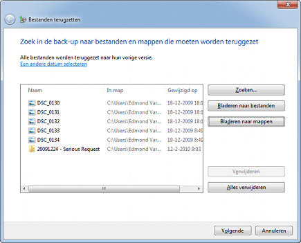 Om gegevens uit een Windows Back-up terug te zetten, opent u het onderdeel Systeem en beveiliging in het Configuratiescherm. Klik dan op Bestanden uit back-up terugzetten. Wilt u gegevens uit de automatische back-up terugzetten? Klik dan op Mijn bestanden terugzetten. Windows opent automatisch de back-ups die u met Windows Back-up hebt gemaakt. Er wordt onderscheid gemaakt tussen het herstellen van losse bestanden of van hele mappen. Klik op Bladeren naar bestanden om losse bestanden te herstellen of Bladeren naar mappen om mappen met alle bestanden en submappen in die map te herstellen. Voeg de bestanden en mappen die u wilt herstellen toe aan de lijst met te herstellen items door deze binnen de back-up te zoeken, te selecteren en dan op Bestanden toevoegen of Mappen toevoegen te klikken. U kunt tegelijk bestanden en mappen aan de lijst toevoegen. Is de selectie compleet, klik dan op Volgende.