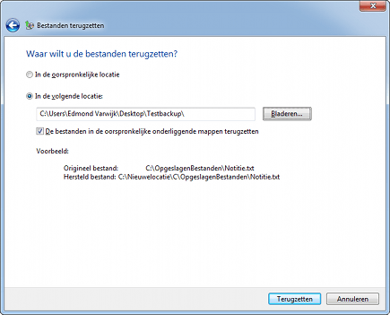 Kies ervoor bestanden op een alternatieve locatie terug te zetten wanneer u nog wel het originele bestand hebt of wanneer u alleen de back-up wilt testen.