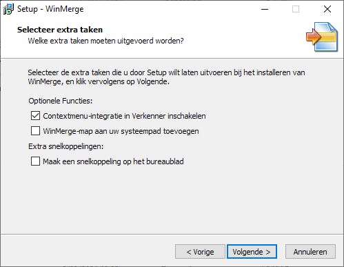 Je haalt WinMerge van www.winmerge.org. We zitten momenteel aan versie 2.16.10. Het gaat om een klein bestand. Tijdens de installatie geef je aan welke componenten je wilt gebruiken. In dit voorbeeld accepteren we alle standaardcomponenten, zoals de filters en plug-ins. We installeren ook meteen de Nederlandse menu’s en vensters. Twee stappen verder kun je in het onderdeel Extra taken aanvinken dat deze tool zich mag integreren in Windows Verkenner. Vanaf dan kun je WinMerge activeren via het contextueel menu als je in verkenner met de rechtermuisknop op een item klikt.