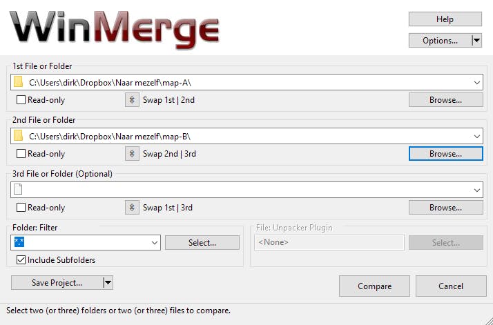 Eerst selecteer je de mappen of bestanden die je wilt matchen en daarna klik je op de knop Compare. Het vak filter staat standaard op *.*, hierdoor vergelijkt WinMerge gewoon alle bestandstypen met elkaar. Vink de optie Include Subfolders aan wanneer de mappen die je vergelijkt submappen bevatten.