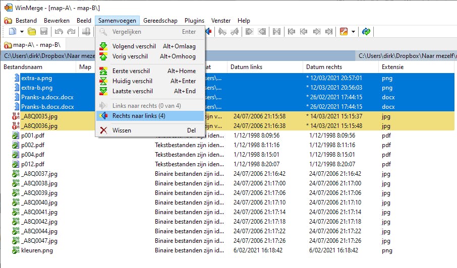 Nu je weet wat de verschillen zijn, kun je de inhoud van de mappen aanpassen. Om ontbrekende bestanden naar links of rechts te kopiëren, selecteer je deze tegelijkertijd door de Ctrl- of de Shift-toets ingedrukt te houden. Shift gebruik je wanneer het gaat om bestanden die netjes onder elkaar aansluiten. Je klikt op het eerste bestand dat je wilt kopiëren, je drukt de Shift-toets in en dan klik je op het laatste bestand in de reeks. De Ctrl-toets druk je in wanneer je de selectie een voor een wilt uitbreiden. Daarna ga je naar het menu Samenvoegen en je kiest de opdracht Links naar rechts of Rechts naar links. Telkens staat tussen haakjes hoeveel bestanden WinMerge op die manier overbrengt. Na deze bewerking verandert de vergelijkingsstatus van deze bestanden in Identiek.