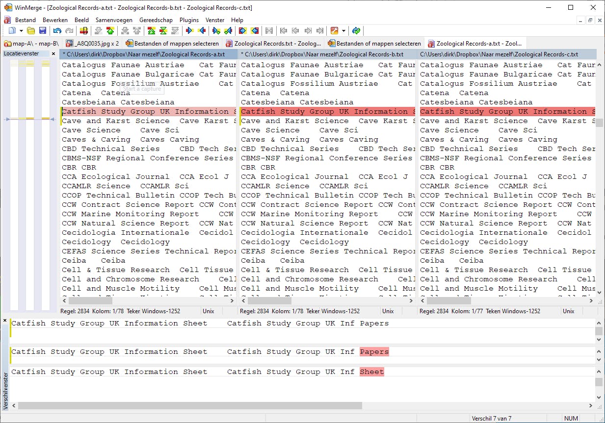 WinMerge kan makkelijk tekstbestanden vergelijken. Om misverstanden te voorkomen: daarmee bedoelen we txt-files. Hoe je Microsoft Word-documenten vergelijkt, leggen we zo dadelijk uit. Deze tekstvergelijking is vooral handig voor mensen die bijvoorbeeld aan scripts, indexen of webpagina’s werken. In dit voorbeeld vergelijken we drie documenten. Het zijn drie versies van een ontzettend lange zoölogische lijst. Het titanenwerk, waar ieder gezond mens gek van wordt, is voor WinMerge een koud kunstje.