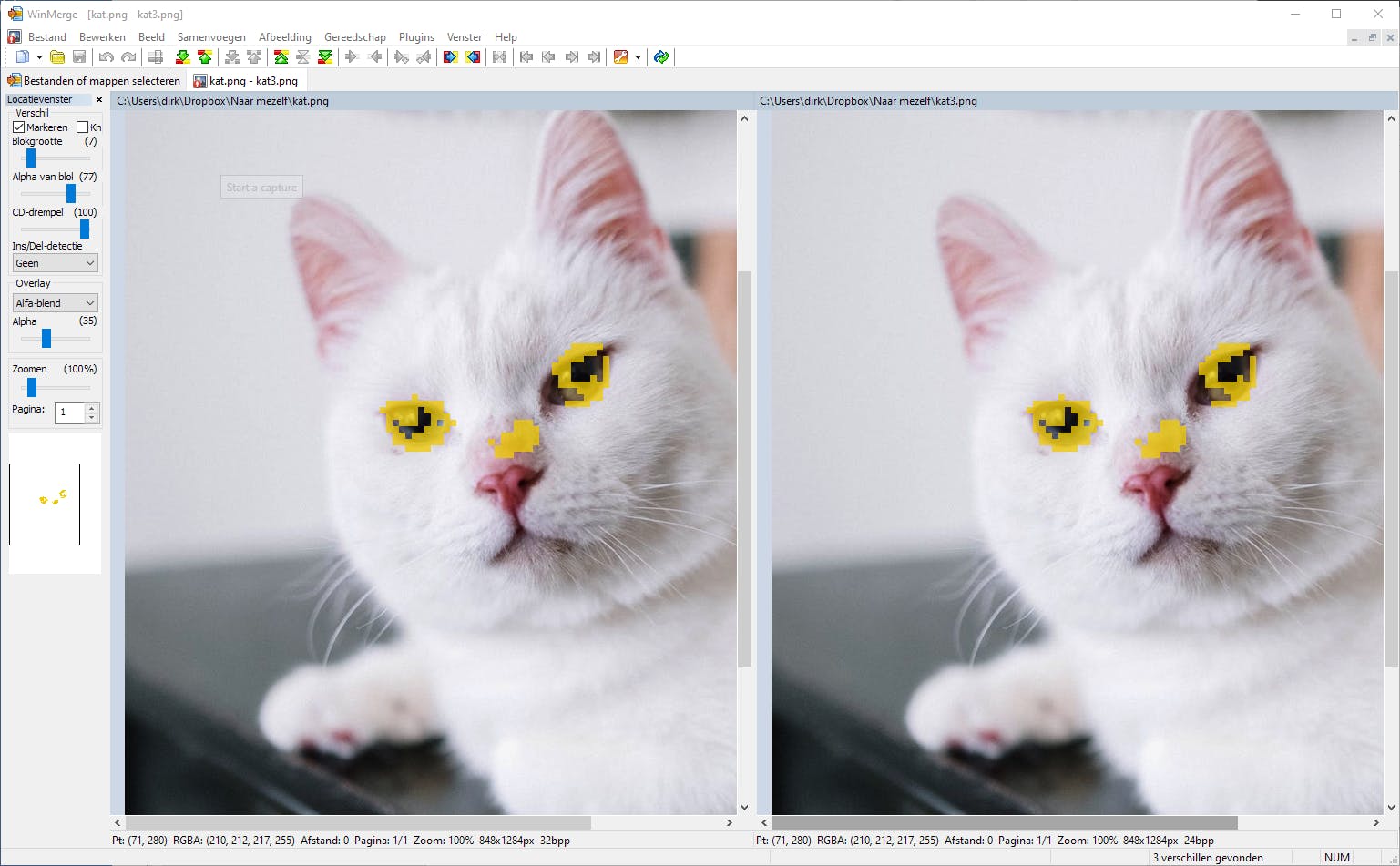 Merk je aan de datum en de bestandsgrootte dat twee afbeeldingen niet identiek zijn, maar zie je op het eerste zicht niet wat er is veranderd? Ook in dat geval helpt WinMerge een handje. In dit voorbeeld hebben we een foto van een kat een beetje gewijzigd. We hebben de vacht op de neus iets aangepast en de ogen ietsepietsie vergroot. Daarna hebben we de beide bestanden opgeslagen in het png-formaat.