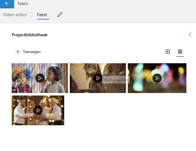 Typ je Video-editor in het zoekvak, dan wordt de editor geopend in een tabblad van de app Foto’s. Klik op de knop Nieuw videoproject en geef het project een naam. Met de knop Toevoegen selecteer je de foto’s en videoclips die op de harde schijf staan. Materiaal dat je te veel hebt ingeladen, kun je verwijderen door het te selecteren en dan op het vuilnisbakje te klikken.