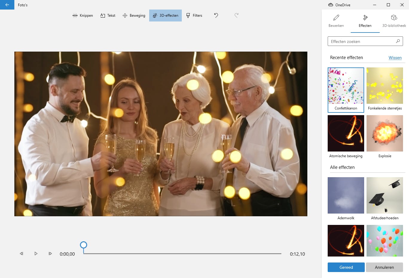Video-editor heeft ook een verzameling filters die een bepaalde sfeer in je project brengen en er is zelfs een uitgebreide collectie 3D-effecten die je op een clip kunt toepassen. Op die manier voeg je een explosie, een dinosaurus, een confettikanon, vlinders of verjaardagballonnen toe. Er is keuze zat.