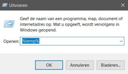 Om deze bestanden in één klap te verwijderen, klik je als eerste met je rechtermuisknop op het Windows icoontje. Kies vervolgens de optie ‘uitvoeren’. In de zoekbalk die nu verschijnt, typ je het volgende: %temp%. De map die vervolgens opent, is de map met alle tijdelijke bestanden. Deze selecteer je allemaal in één keer met de toetscombinatie Ctrl+A. Duw vervolgens op delete. Je zult nu zien dat je een stuk meer ruimte hebt op je computer.