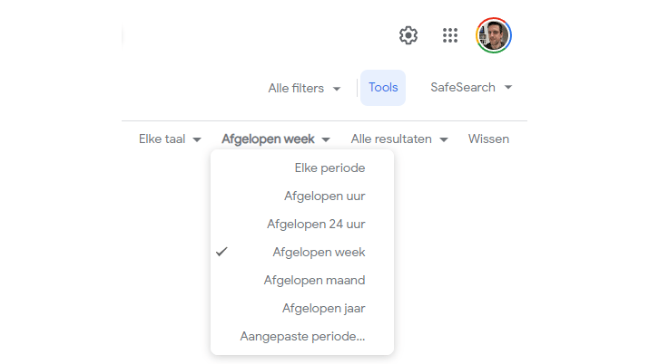 Het web staat vol met gedateerde informatie. Er komen dan ook geregeld zoekresultaten met ‘oude’ webpagina’s bovendrijven. Daar kun je iets aan doen. Voer in Google een zoekopdracht uit en klik rechtsboven op Tools. Kies nu Elke periode, waarna er een keuzemenu opent. Je kunt bijvoorbeeld zoekresultaten van de afgelopen 24 uur, week of maand weergeven. Ben je op zoek naar het laatste nieuws, dan klik je op Afgelopen uur. Nadat je een keuze hebt gemaakt, past Google meteen zijn zoekresultaten aan.
