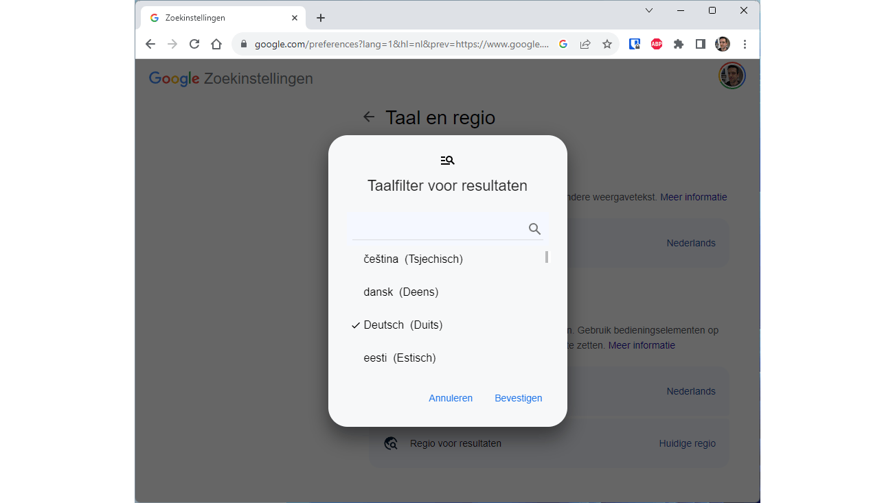 Het is ook mogelijk om naast Nederlands andere talen in te stellen. Klik rechtsboven op het tandwielpictogram. Er verschijnt een deelvenster met enkele instellingen. Kies Taal / Taalfilter voor resultaten. Je gebruikt het zoekveld of het keuzemenu om één of meerdere talen te selecteren. Klik op Bevestigen en vervolgens bovenaan op het pijltje om naar de zoekmachine terug te keren. Via Tools / Elke taal kun je de zojuist gekozen taal of talen activeren.