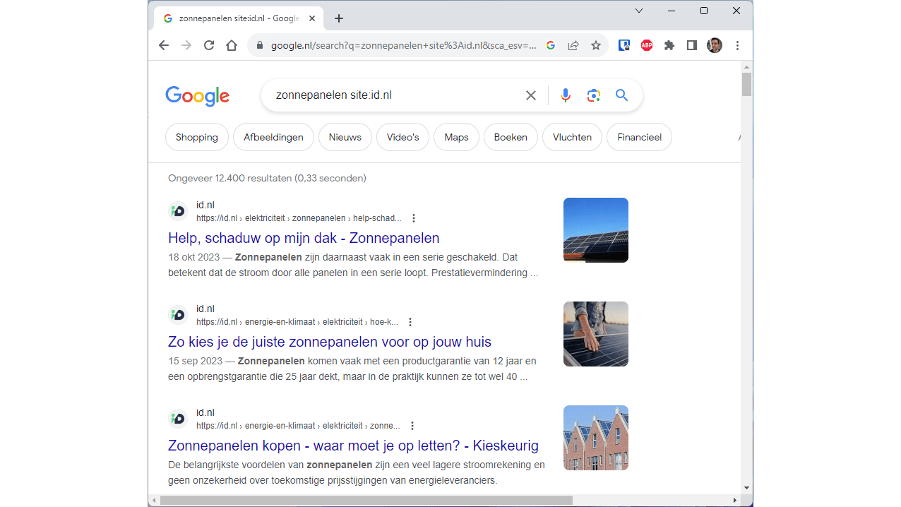 Een heleboel websites hebben een belabberde zoekfunctie. Om die reden komen lang niet altijd relevante treffers bovendrijven. Dat kan Google beter. Handig voor het geval je zeker weet dat een bepaalde tekst op pakweg een nieuwsdienst of forum heeft gestaan. Gebruik hiervoor de opdracht site: gevolgd door de naam van de website. Typ je bijvoorbeeld zonnepanelen site:id.nl, dan toont Google webpagina’s over zonnepanelen die op de informatieve website ID.nl zijn gepubliceerd. Typ na de dubbele punt overigens geen spatie, want anders werkt het niet.