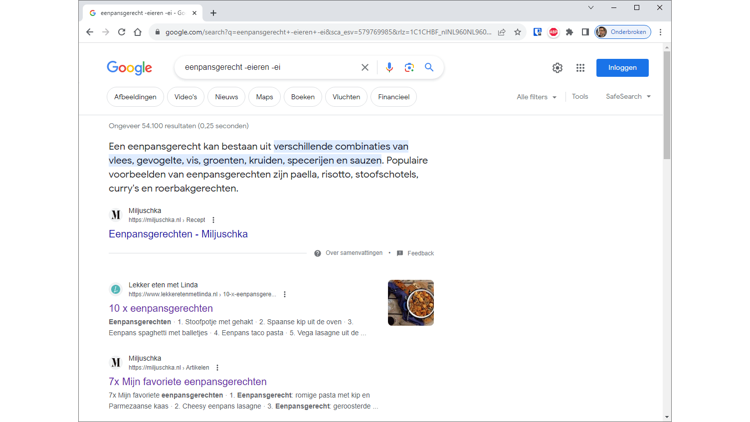 Soms is het zinvol om een bepaald woord van een zoekactie uit te sluiten. Dat doe je met het minteken. Ben je bijvoorbeeld op zoek naar een smaakvol eenpansgerecht, maar wil je een recept zonder eieren? Typ dan eenpansgerecht -eieren -ei. Deze optie is overigens ook nuttig om websites uit te sluiten. Wie weet kom je bij het zoeken naar producten wel erg veel op Marktplaats terecht. Lastig wanneer je voornamelijk naar nieuwe spullen zoekt. Voeg in dat geval -site:marktplaats.nl aan de zoekopdracht toe.