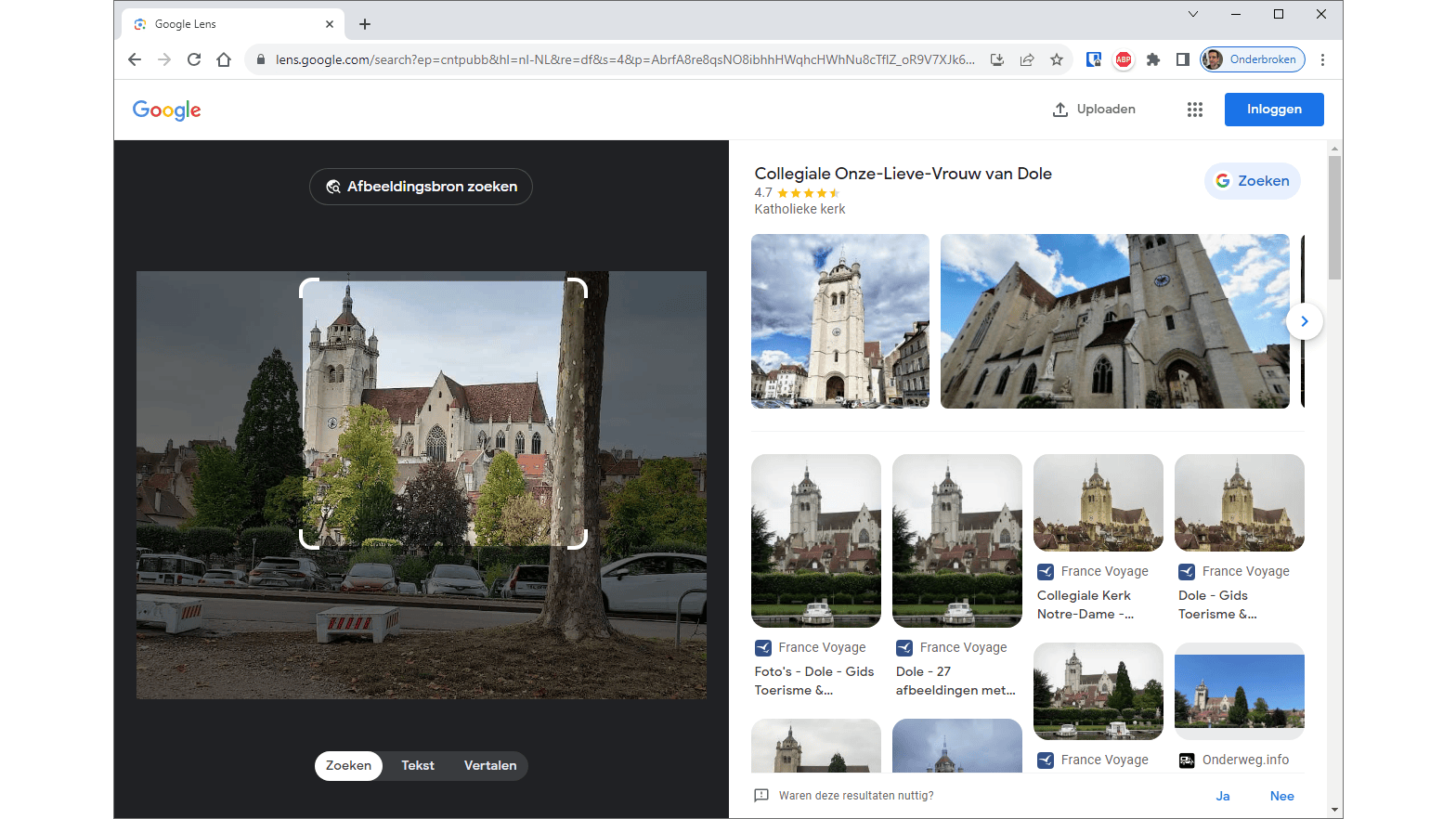 Het werkt eenvoudig. Klik aan de rechterkant van het Google-zoekveld op Zoeken op afbeelding (pictogram met gekleurde camera). Je hebt nu twee mogelijkheden. Via Upload een bestand selecteer je een foto op de computer. Bevestig daarna met Openen. De resultaten verschijnen aan de rechterkant. Overigens toont Google mogelijk ook verwante afbeeldingen van andere fotografen, bijvoorbeeld van bekende gebouwen. Klik op Afbeeldingsbron zoeken om een complete lijst met webpagina’s weer te geven.