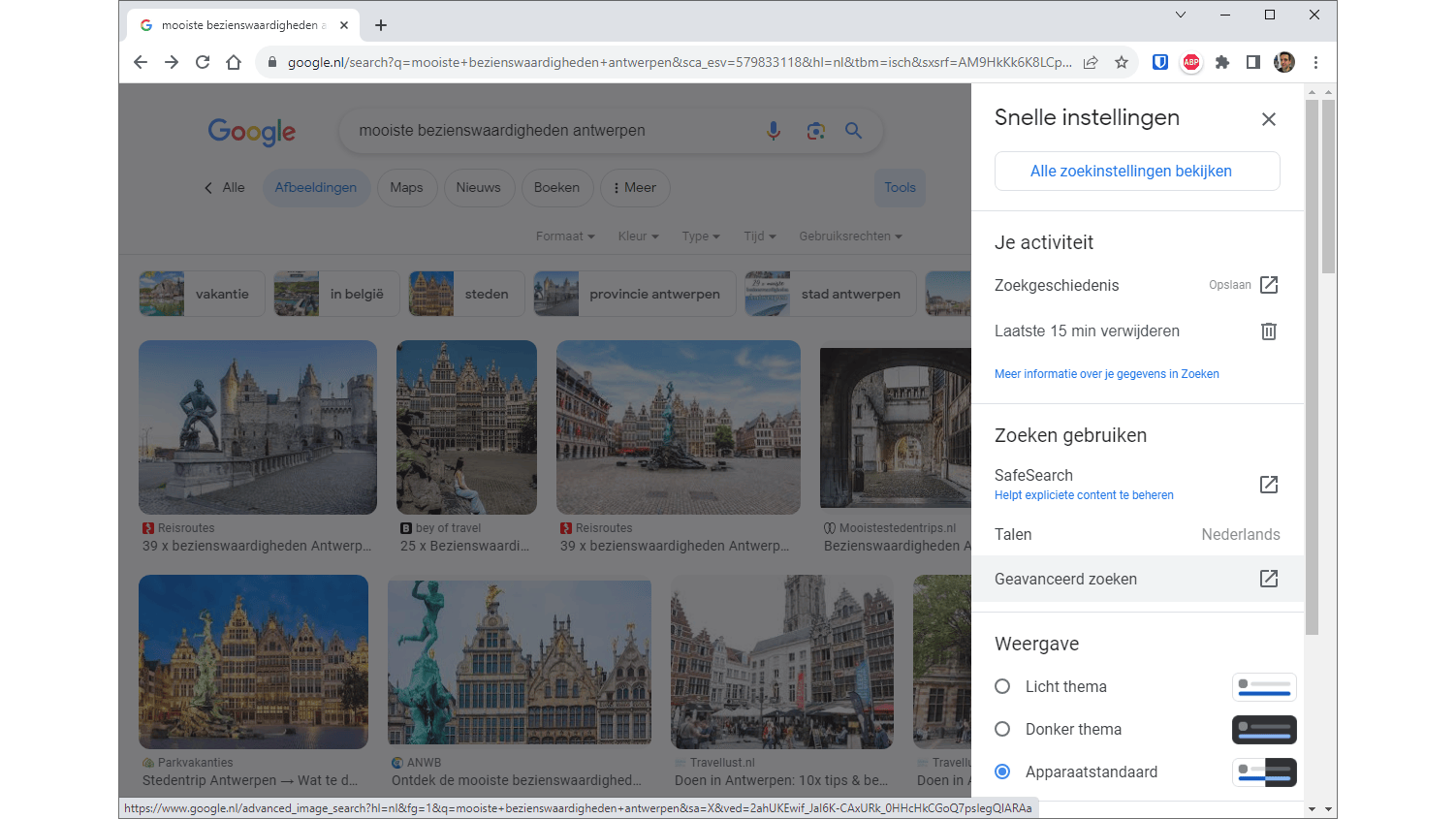 Je gebruikt Google Afbeeldingen ook voor gerichte speuracties. Op die manier kun je bijvoorbeeld naar foto’s in een hoge resolutie of specifieke bestandsindeling zoeken. Klik hiervoor rechtsboven op het tandwielpictogram en daarna op Geavanceerd zoeken. Neem alle opties zorgvuldig door. Zo selecteer je achter afbeeldingsformaat de beoogde fotoresolutie. Via type afbeelding kun je bijvoorbeeld uitsluitend naar gezichten of animaties speuren. Tot slot zijn de opties achter bestandstype de moeite waard. Hier kies je de gewenste bestandsindeling, bijvoorbeeld jpg, png, gif of raw. Bevestig onderaan met Geavanceerd zoeken.