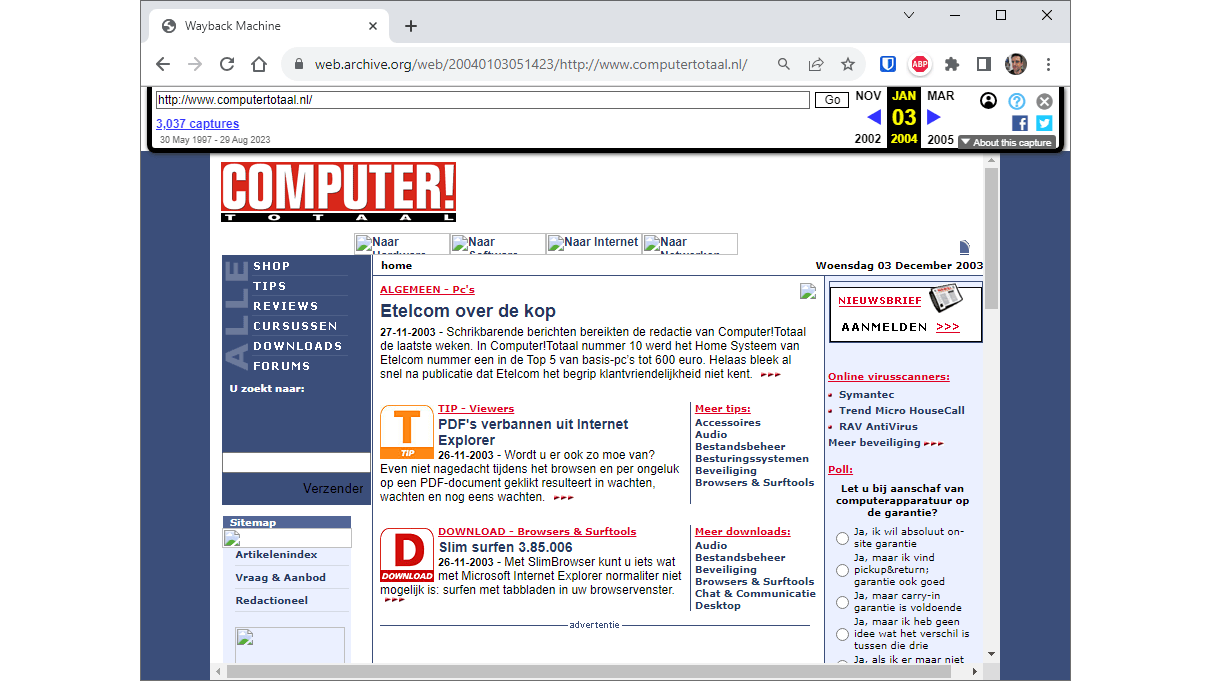 Wayback Machine De webdienst Wayback Machine geeft je toegang tot een archief van miljarden opgeslagen webpagina’s. Zodra je bijvoorbeeld www.computertotaal.nl invoert, verschijnt er een tijdlijn van 1997 tot en met 2023. Zo kun je informatie die wellicht niet meer online staat, tóch nog opsporen. Je kunt zelfs op links klikken om oude artikelen te lezen. Gebruik de pijltjes rechtsboven om naar de vorige of volgende momentopname van de opgegeven url te gaan. Overigens ziet de online omgeving van Computer!Totaal er vanaf eind 2022 heel anders uit. De website is toen namelijk opgegaan in ID.nl.