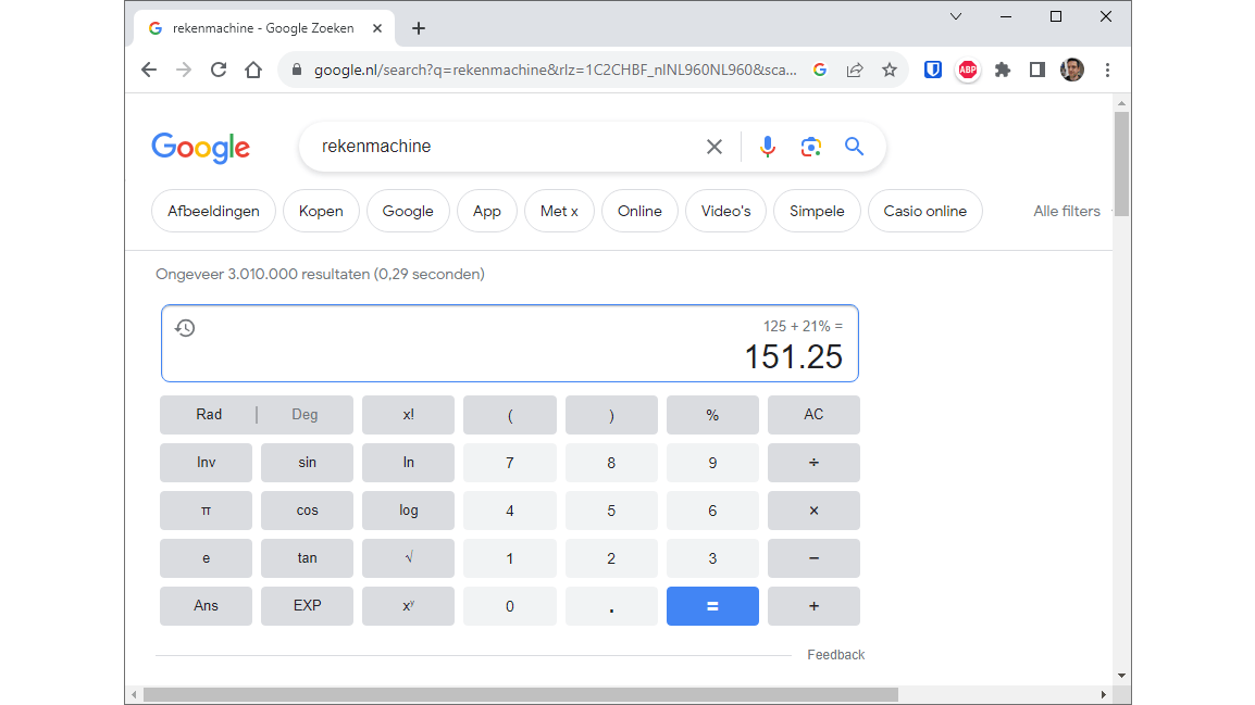 Rekenmachine Voor berekeningen kun je eveneens bij Google terecht. Typ Rekenmachine en druk op Enter. Boven de zoekresultaten duikt er een digitale calculator op. Je gebruikt voor de invoer de virtuele knoppen of het fysieke toetsenbord. Rechtstreeks binnen het zoekveld rekenen kan trouwens ook. Typ gewoon de som en druk op Enter.