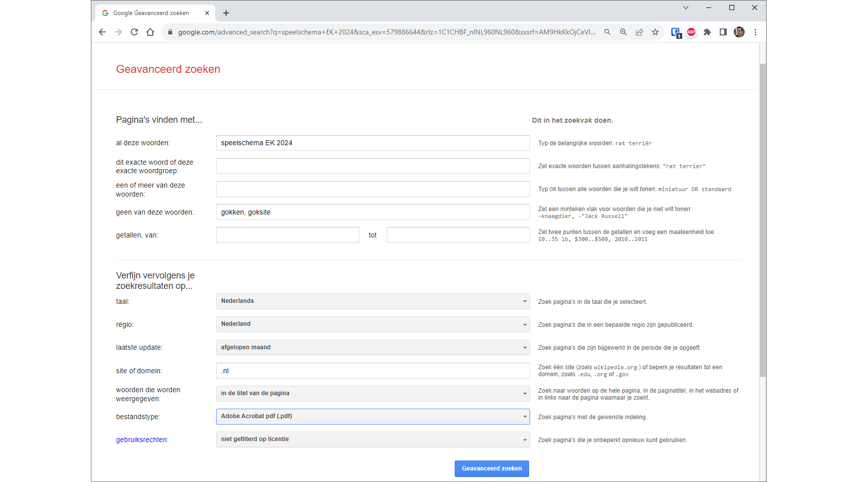 In het onderste deel selecteer je de taal, regio en tijd. Je kunt daarnaast een specifieke website doorzoeken of een domeinextensie selecteren, zoals id.nl of .nl. Bepaal ook waar de trefwoorden idealiter worden weergegeven. Standaard is dat op elke willekeurige plek in de webpagina. Je kunt Google als alternatief ook enkel in titels en url’s speuren naar de trefwoorden. Wanneer je bepaalde documenten wilt vinden, selecteer je het beoogde bestandstype. Je kiest onder meer tussen pdf, doc, rtf en xls. Bevestig ten slotte met Geavanceerd zoeken.