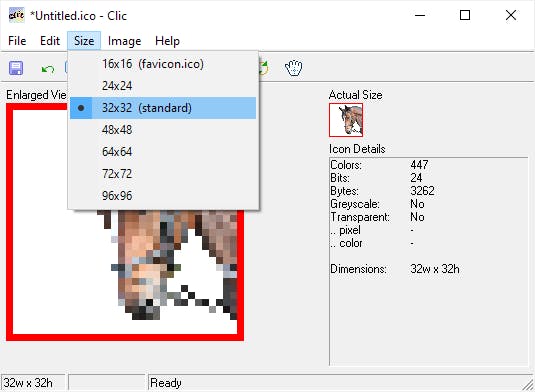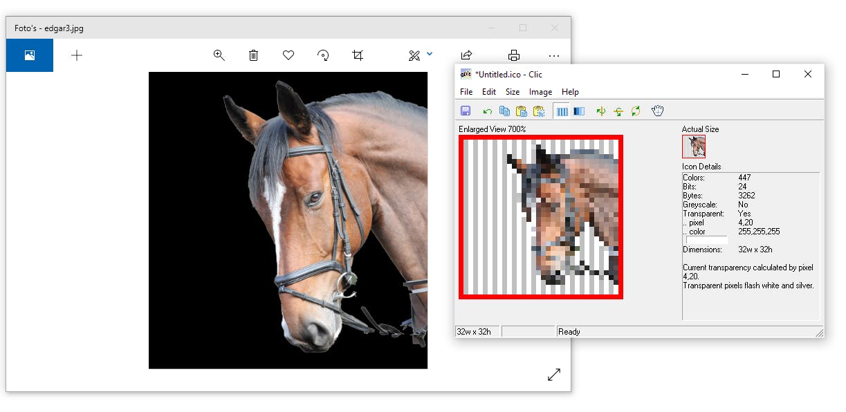 Het programma om snel een pictogram van foto’s te maken heet Clic. Hier vind je de draagbare versie. Dat betekent dat er geen installatieprocedure is en dat je de kleine tool zelfs vanaf een usb-stick kunt laten werken. Leuk aan Clic is de eenvoudige interface. In het grote vierkant links zie je de vergrote voorstelling van het pictogram, in het paneel aan de rechterkant herken je het pictogram aan de ingestelde grootte. Hier lees je ook de eigenschappen van de mini-afbeelding zoals het aantal gebruikte kleuren, de afmetingen, het aantal bits, eventueel de instelling grijswaarden en of er transparantie is.