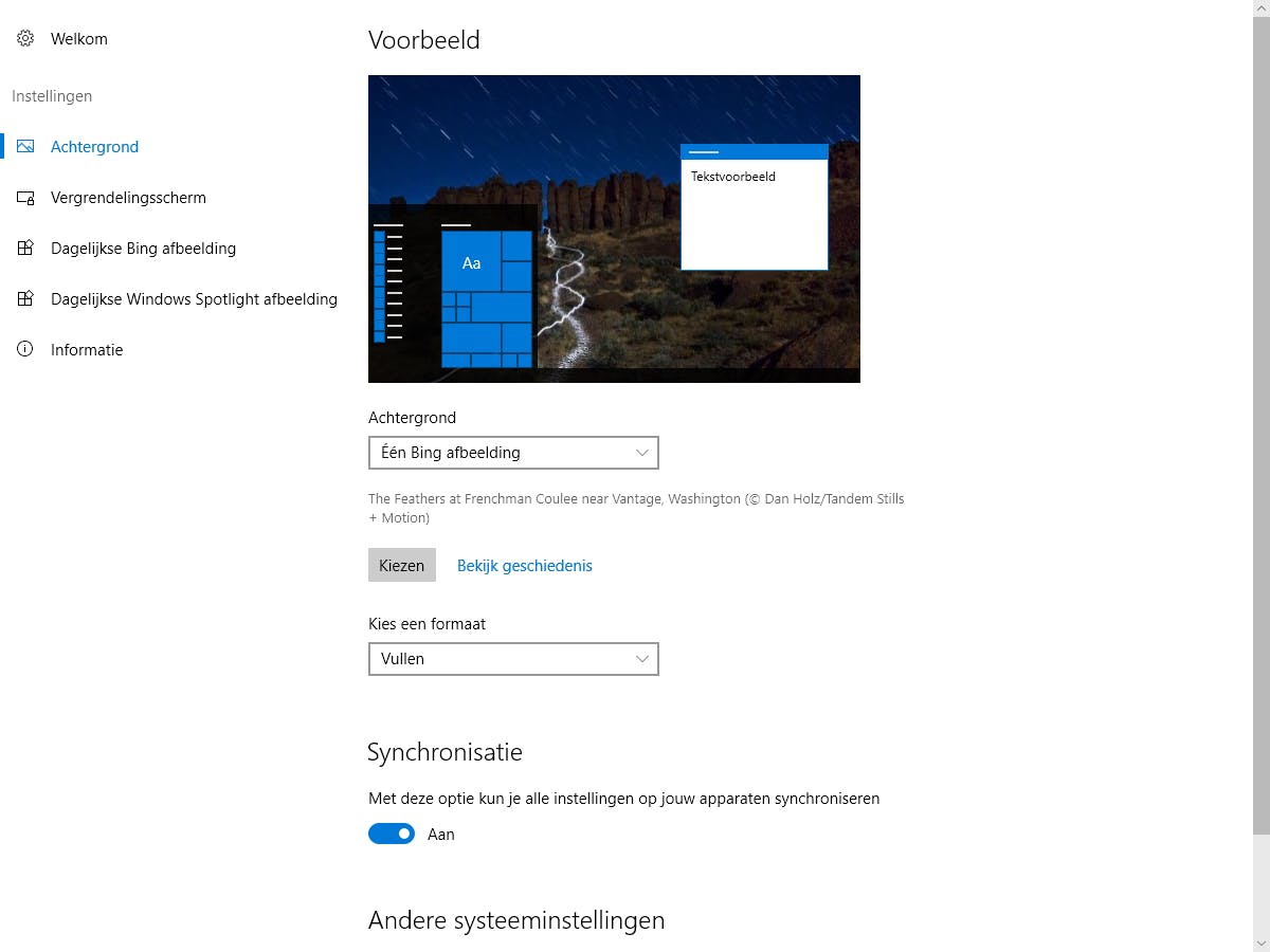 Kies je aan de linkerkant Vergrendelingsscherm, dan ben je bij de opties om voor dit scherm dezelfde keuzes te maken als voor je bureaubladachtergrond. Je selecteert een formaat: Vullen, Passen, Rekken of Centreren. Ook hier kun je deze instellingen weer laten synchroniseren met al je Windows-toestellen, zodat je pc, laptop, Windows-tablet en Windows-telefoon hetzelfde vergrendelingscherm hebben.