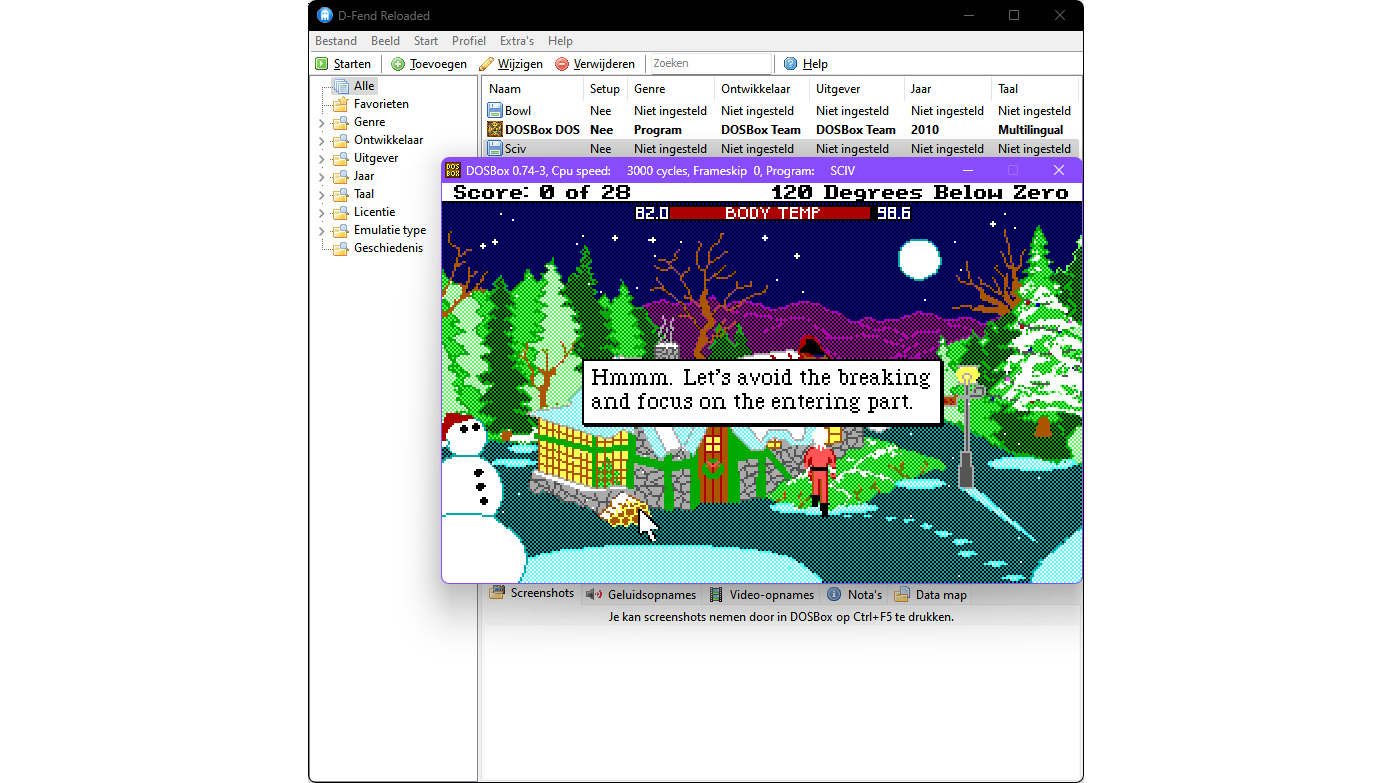 DOSBox biedt uitgebreide configuratiemogelijkheden, zelfs per game, via het bestand dosbox.conf, standaard te vinden in C:\Users\<accountnaam>\AppData\Local\DOSBox. Een uitgebreide uitleg vind je op deze pagina. Dit is helaas behoorlijk complex, maar grafische interfaces als D-Fend Reloaded of AmpShell vereenvoudigen dit proces. Laten we D-Fend Reloaded als voorbeeld nemen. Installeer en start de app en kies je taal. Je kunt de DOSBox-installatie gebruiken die samen met D-Fend Reloaded werd geïnstalleerd of je kiest voor Aangepaste DOSBox installatie en verwijst naar de eigen installatiemap van DOSBox.