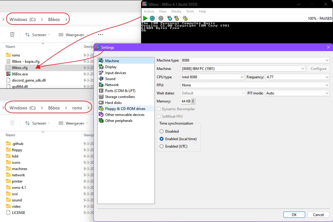 Als je 86box.exe opstart, lijkt een heuse IBM Personal Computer op te starten in een venster. In de map C:\86box vind je nu het configuratiebestand 86box.cfg, dat je met een teksteditor kunt aanpassen. Maak eerst een kopie van dit bestand voor de veiligheid.