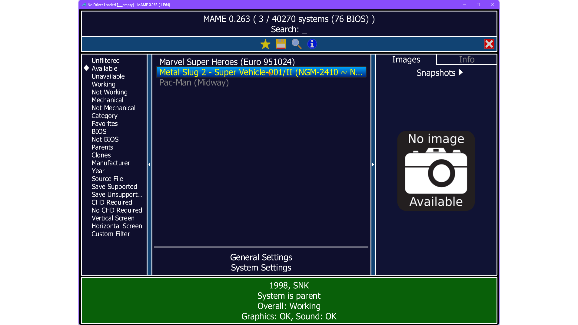 Bij het opstarten van MAME, vind je de geïnstalleerde ROM’s terug onder Available. Voor je een spel start, kun je via System Settings of General Settings de configuratie aanpassen, zoals de besturing, het geluid en de grafische instellingen. Een spel starten doe je door het in de lijst te selecteren. Om MAME te verlaten, gebruik je de Windows-toets, Alt+Tab of Alt+Enter om eerst de fullscreen-modus te verlaten.