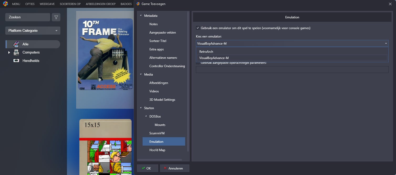Je kunt ook handmatig een game toevoegen, zoals een Game Boy-spel. Ga daarvoor naar Menu / Tools / Importeer / Handmatig Spel Toevoegen, vul bij Metadata een Titel in en geef bij Starten / Applicatie Pad het volledige pad naar je gamebestand op. Zet bij Starten / Emulation een vinkje bij Gebruik een emulator om dit spel te spelen (voornamelijk voor consolegames) en bevestig met Toevoegen. Kies een geschikte emulator in het uitklapmenu, in dit geval bijvoorbeeld VisualBoyAdvance-M of de AIO-emulator RetroArch. Klik op Bladeren om naar het bijbehorende Applicatie Pad te verwijzen en bevestig met OK (2x). Het spel kan beginnen.