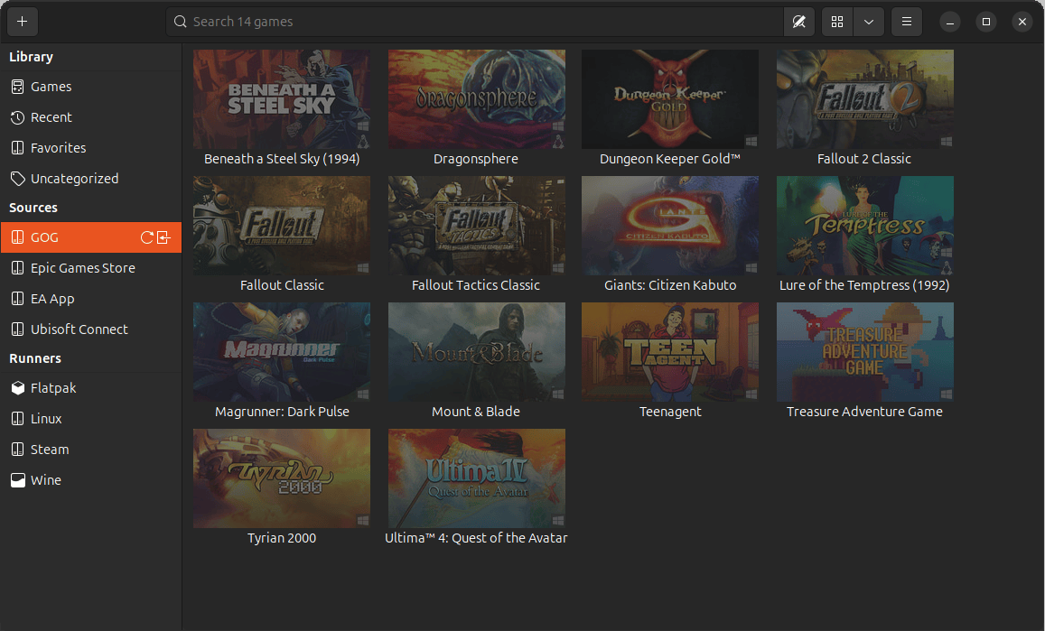 Als je door de jaren heen een gamecollectie hebt aangelegd die je ook onder Linux wilt blijven spelen, dan komt Lutris goed van pas. Dit geeft je in één programma toegang tot je games uit Steam, Epic Games Store, GOG en Humble Bundle. Bovendien heeft Lutris allerlei installers voor Windows-games die het dan via Wine emuleert met de optimale configuratie. Op dezelfde manier installeert het programma voor andere games de benodigde compatibiliteitslagen, emulatoren of game engines, zodat je dat zelf niet meer hoeft te doen. Zo gebruikt Lutris voor PlayStation-games en dergelijke RetroArch.