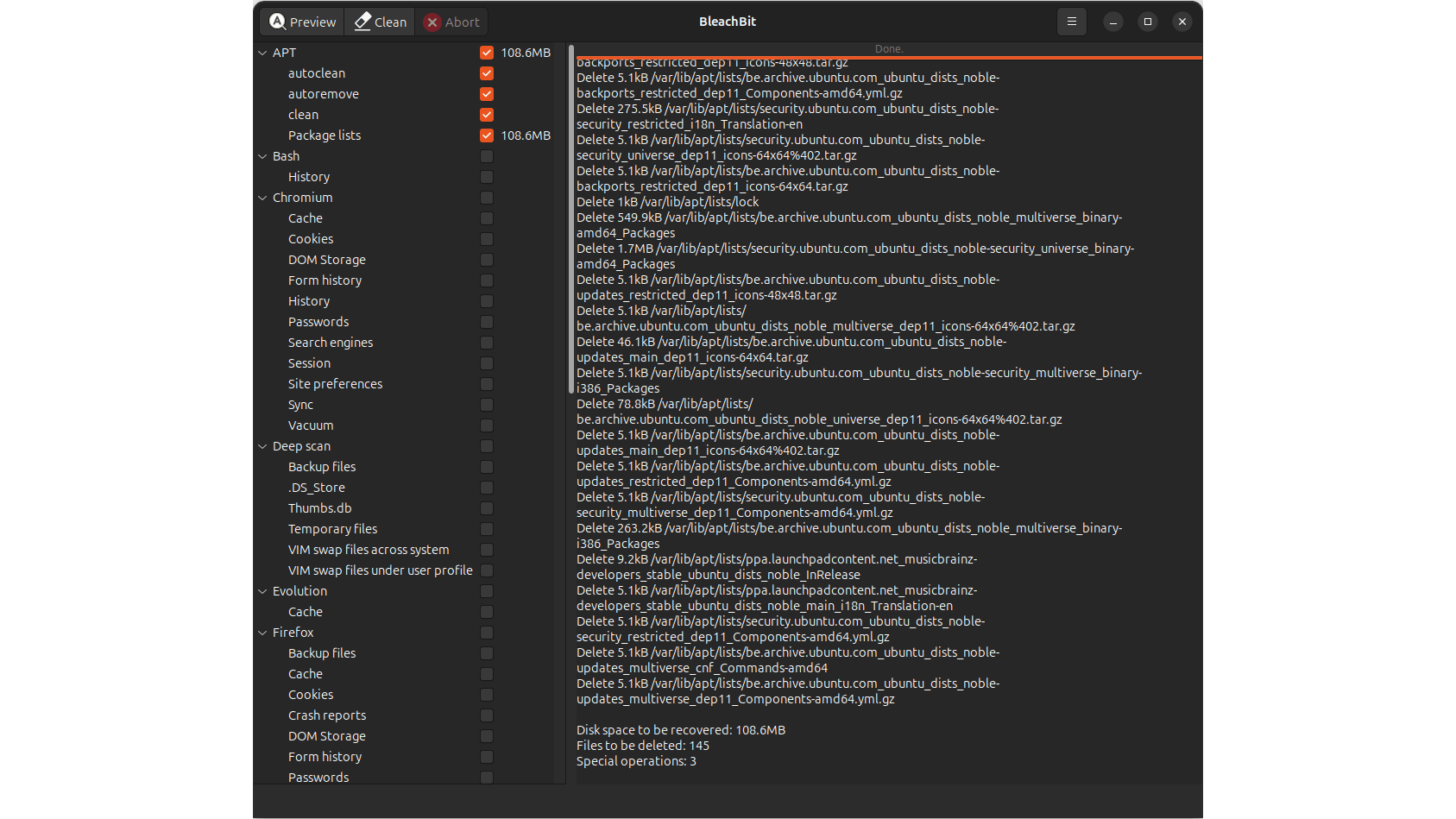 Als je al jarenlang met dezelfde Linux-installatie werkt, die je keer op keer upgradet, waarop je software installeert en weer verwijdert, dan heeft zich na een tijd waarschijnlijk een hoop digitale rommel opgehoopt op je systeem. BleachBit helpt je om je systeem weer schoon te maken. Daardoor heb je weer wat meer ruimte vrij op je schijf, en back-up je bijvoorbeeld ook niet onnodig te veel bestanden. Je selecteert zelf wat je wilt opschonen en kunt een preview opvragen van welke bestanden er worden verwijderd voordat je de opdracht daartoe geeft.
