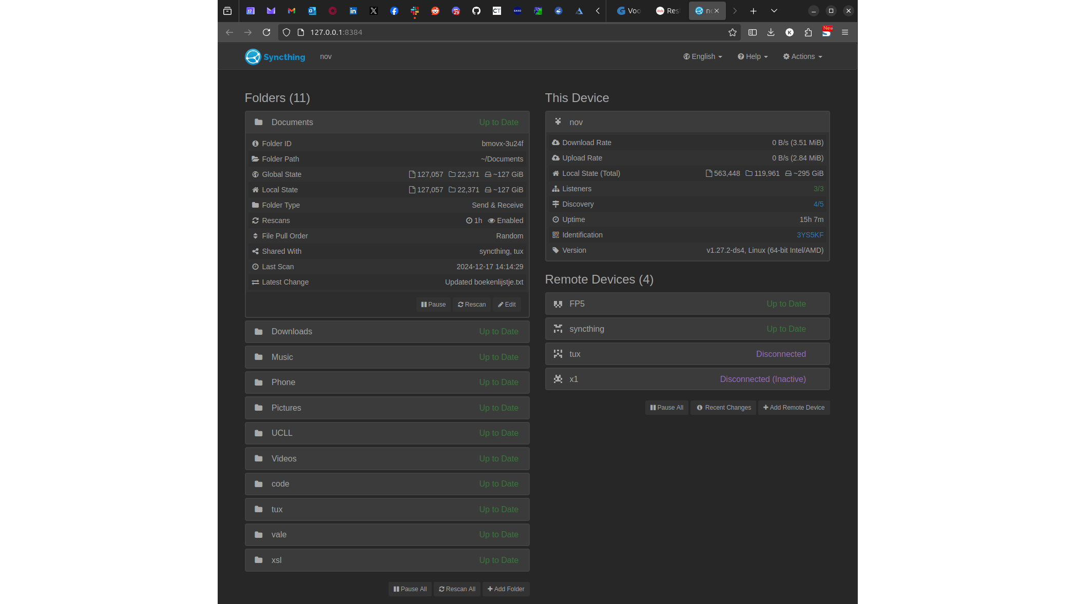Wil je eenvoudig toegang tot dezelfde bestanden op je Linux-machine als op je andere computers? Dan is een bestandssynchronisatieprogramma zoals Syncthing onmisbaar. Synchroniseer zoveel mappen als je wilt tussen je apparaten en stel per map in met welke apparaten je deze wilt synchroniseren en in welke richting. Dit werkt zowel op je lokaal netwerk als via internet, zonder dat je port forwarding hoeft in te stellen. Nadat je Syncthing hebt ingesteld, heb je er geen omkijken meer naar. Alle wijzigingen op één computer worden in enkele seconden op de achtergrond met de andere computers gesynchroniseerd.