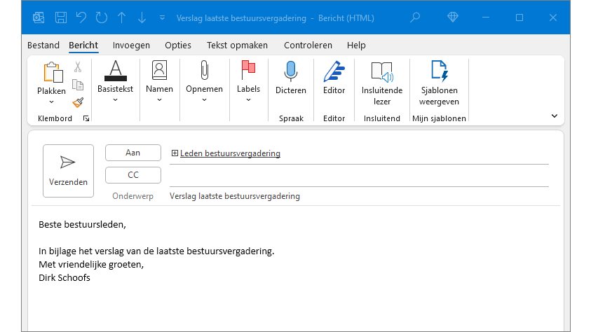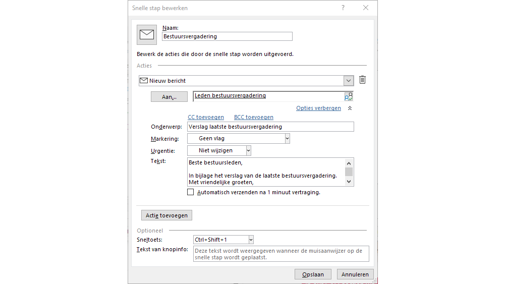Om het helemaal gemakkelijk te maken, kies je onderaan een sneltoets, zodat je later via een sneltoets het volledige bericht kant en klaar op het scherm krijgt. Je kunt natuurlijk ook dubbelklikken op de naam van de snelle stap in het tabblad Start. Het enige wat je dan nog moet doen, is de bijlage toevoegen en op Verzenden klikken.
