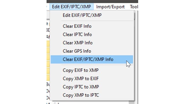 Kijken we naar de functies onder de twee menu-items Edit exif/PICT/XMP en Import/Export. Onder het eerste menu-item vind je mogelijkheden om de diverse exif-vormen op te schonen (= clear) en onderling te kopiëren (= copy).