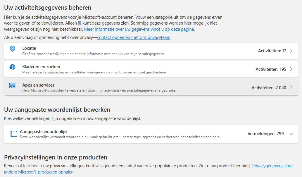 Om erachter te komen welke gegevens Microsoft van jou als gebruiker verzamelt, kun je na aanmelding het privacydashboard raadplegen. Start bij Uw productiviteit verbeteren. Een teller toont hoeveel activiteiten Microsoft heeft vastgelegd voor Locatie, Bladeren en zoeken, en Apps en services. Kies een categorie voor meer details en selecteer Alle activiteiten weergeven voor een chronologisch overzicht met zoekfunctie, waar je items individueel of alle gegevens tegelijk kunt verwijderen. Bij Apps en services vind je bijvoorbeeld activiteiten van OneDrive, Skype, Microsoft Store, en je kunt hier ook apps de toegang ontzeggen.