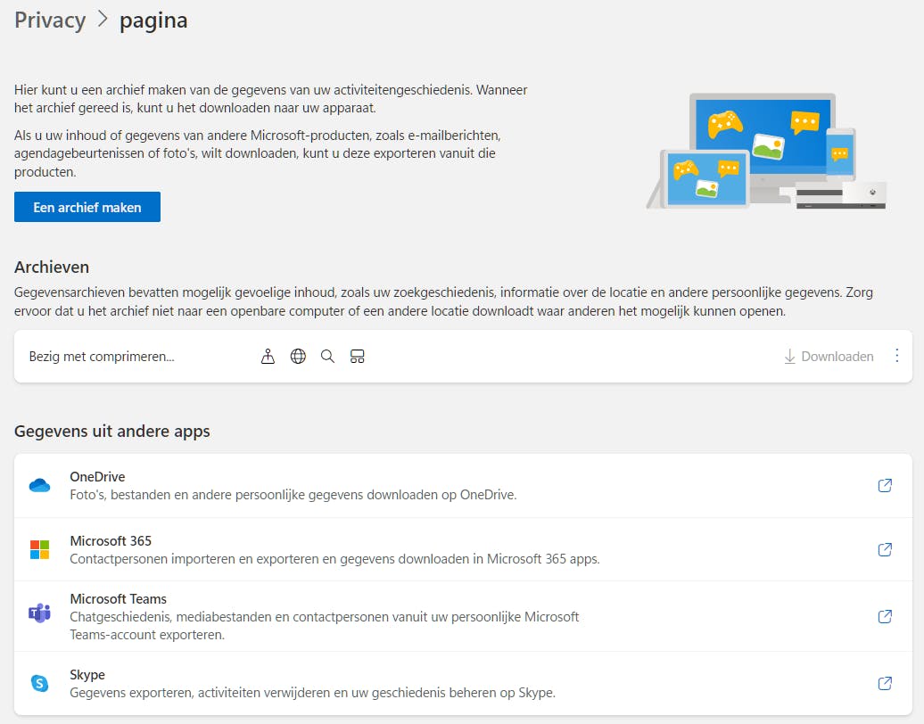 Net als bij Google is het bij Microsoft verstandig om eerst je opgeslagen data te exporteren en te controleren welke apps en diensten aan je Microsoft-account zijn gekoppeld. Hier klik je op Een archief maken, selecteer je de gewenste rubrieken en bevestig je met Een archief maken. Het gecomprimeerde archief kun je vervolgens downloaden. Je vindt hier ook opties om data van apps als OneDrive, Microsoft 365, Microsoft Teams en Skype te downloaden.