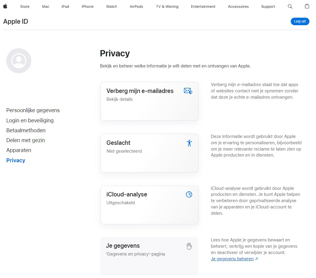 Je kunt een aantal gegevens bekijken en beheren via je Apple ID-accountpagina. Na aanmelding zie je bij Apparaten welke toestellen aan je account gekoppeld zijn. Via Privacy / Je gegevens beheren vind je opties om je gegevens te corrigeren, inclusief je Apple ID-accountgegevens en je accountgegevens bij de App Store en andere Apple-diensten. Op je iOS-apparaten kun je via Instellingen / Privacy instellen welke apps toegang hebben tot gevoelige gegevens zoals je locatie en contacten, en kun je systeembrede privacyinstellingen aanpassen. Je kunt ook de optie iCloud-analyse uitschakelen op https://privacy.apple.com om te voorkomen dat gebruiksdata van je iCloud-account worden doorgestuurd.