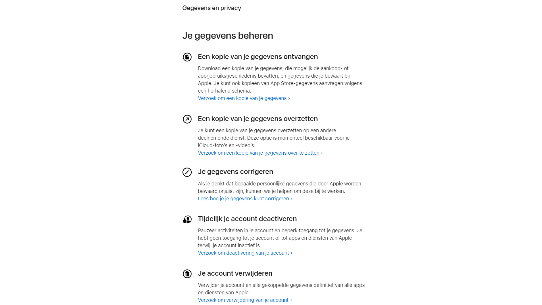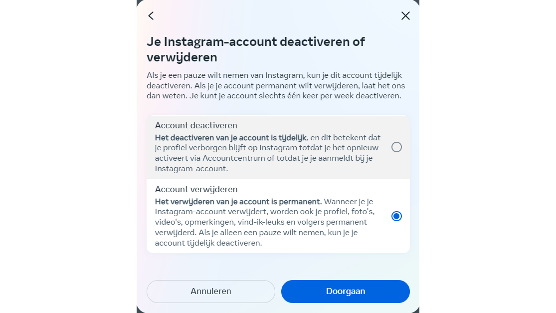 Terug bij Je gegevens beheren heb je de keuze om je account tijdelijk op non-actief te zetten via Verzoek om deactivering van je account, of je account definitief te verwijderen via Verzoek om verwijdering van je account; bevestig dit met Ga door. Je hebt een bedenktijd van zeven dagen.