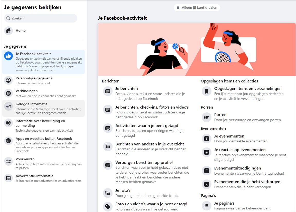 Dit datakluwen kun je (proberen te) beheren via het Accountcentrum, waaraan je accounts van Facebook en Instagram kunt toevoegen. Ga naar Je gegevens en toestemmingen en selecteer Je gegevens bekijken om te zien welke informatie Meta over jou heeft verzameld. Vanuit deze sectie kun je doorgaan naar Je Facebook-activiteit, waar je toegang hebt tot tientallen onderdelen zoals Berichten, Reacties, Chatberichten, Evenementen, Verbindingen (zoals Vrienden en Volgers) en Gelogde informatie (zoals Zoeken en Locatie). Hier kun je ook veel van deze specifieke data verwijderen.
