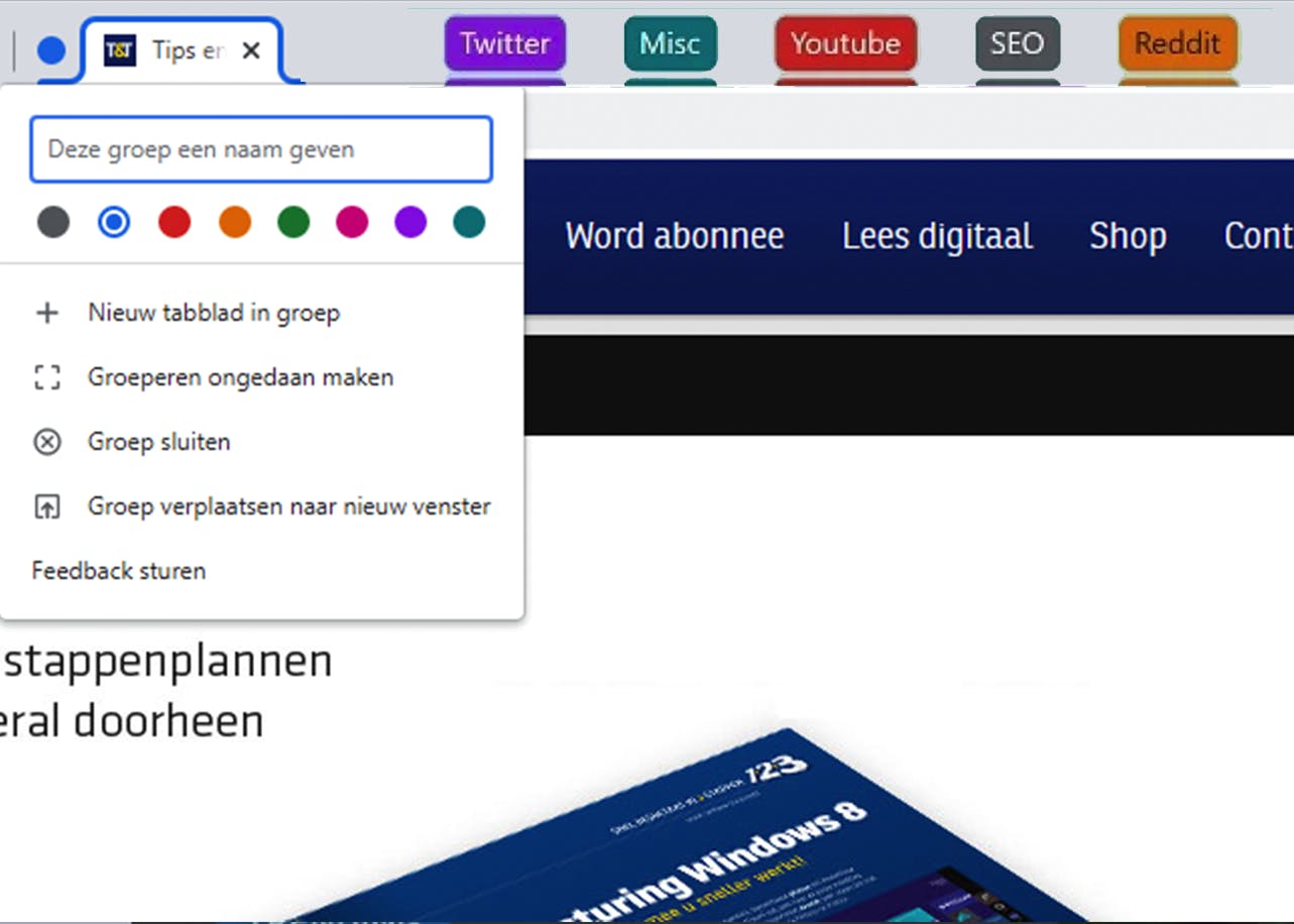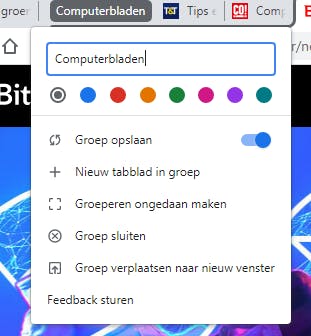 Ook is het mogelijk om nieuwe tabbladen te plaatsen in de bestaande tabbladgroepen. Open daarvoor een nieuw tabblad, klik er met de rechtermuisknop op, kies voor Toevoegen aan de bestaande groep en selecteer vervolgens de naam. De volgorde van de tabbladgroepen wijzig je eenvoudig door de tabbladgroepen te slepen.