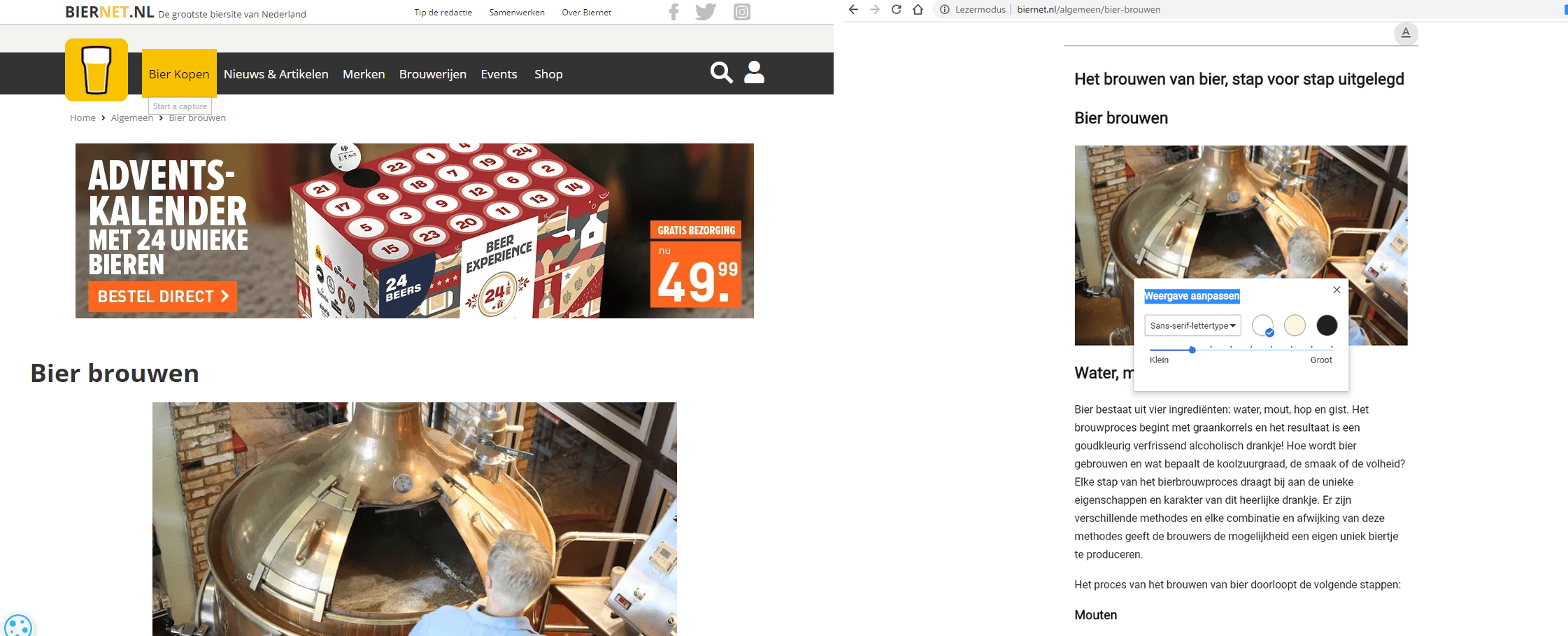 Als je daarna een nieuwe pagina opent en je klikt in het adresvak, dan zie je de nieuwe knop Lezermodus aanzetten. Klik daarop om de pagina van alle afleiding te ontdoen, zodat alleen de afbeeldingen en de tekst overblijven. Bovenaan de pagina verschijnt ook nog een knop met daarin de letter A. Hiermee kun je een voor jou prettig leesbaar lettertype en fijne achtergrond selecteren.