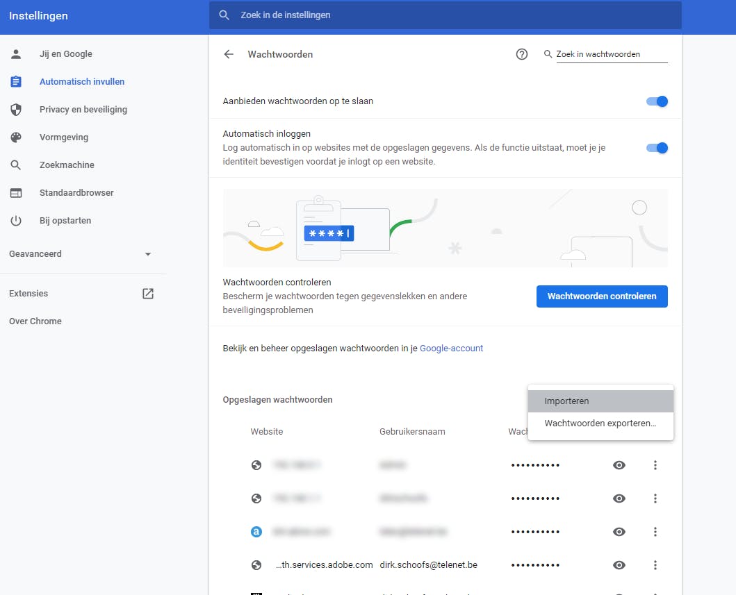 Klik nu op de drie puntjes naast Opgeslagen wachtwoorden zodat de opdrachten Importeren en Wachtwoorden exporteren verschijnen. Kies de laatste optie en navigeer naar de locatie op de harde schijf waar je het csv-bestand wilt opslaan. Om een lijst met wachtwoorden te importeren, gebruik je de opdracht Importeren.