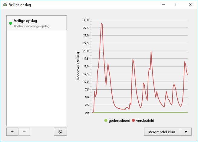 Als je Cryptomator eenmaal hebt ingesteld werkt de extra beveiligingsoplossing zeer eenvoudig. Klik op het plusteken en kies Creëer nieuwe kluis. Blader naar een map in je cloudopslag (bijvoorbeeld in je Dropbox) en geef een bestandsnaam op. Wij kiezen voor ‘Veilige opslag’. Stel een goed wachtwoord in en bevestig met Creëer kluis. Je kluis verschijnt links in beeld in een lijst. Klik op een kluis, geef je wachtwoord op en bevestig met Ontgrendel kluis. Er wordt een extra schijfletter geopend, vergelijkbaar met een usb-stick die je aansluit. Alles wat je naar deze schijfletter kopieert wordt automatisch veilig opgeslagen.