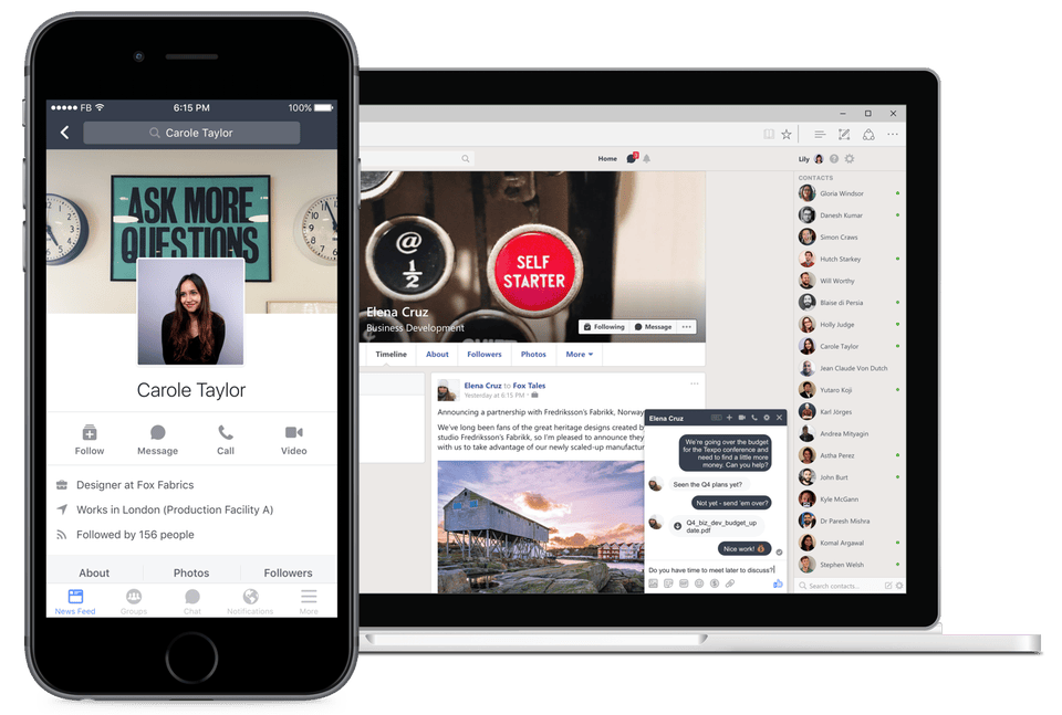 Facebook heeft met Workplace een zakelijke samenwerkingsdienst uitgebracht waarmee werknemers binnen bedrijven met elkaar kunnen samenwerken. Hiermee wordt Facebook een concurrent van onder andere Slack en Microsofts Yammer.